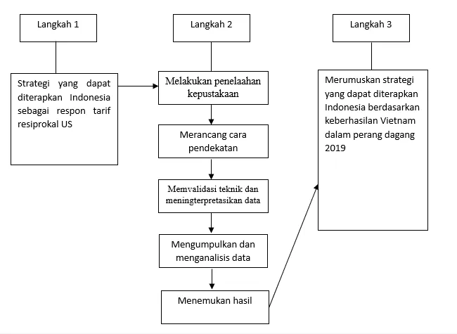 Metodologi dalam kajian ini menggunakan metode Pendekatan komparatif. Pendekatan komparatif digunakan untuk membandingkan kebijakan di suatu negara. Penelitian ini bersifat kualitatif-deskriptif dengan membandingkan strategi vietnam pada tahun 2019 sebagai best practices dan skenario Indonesia merespons tarif resiprokal AS 2025 dalam 3 dimensi utama : Diversifikasi pasar, kualitas FDI, dan diplomasi perdagangan. Teknik pengumpulan data menggunakan instrumen dokumentasi, yaitu mencari data mengenai variabel dengan sumber data berupa buku, jurnal, situs internet, dan sebagainya yang terkait dengan topik terpilih. Teknik analisis data yang digunakan adalah metode analisis isi (Content Analysis) dengan penekanan pada proses memilih, membandingkan, menggabungkan, dan memilah berbagai pengertian hingga ditemukan informasi yang relevan.